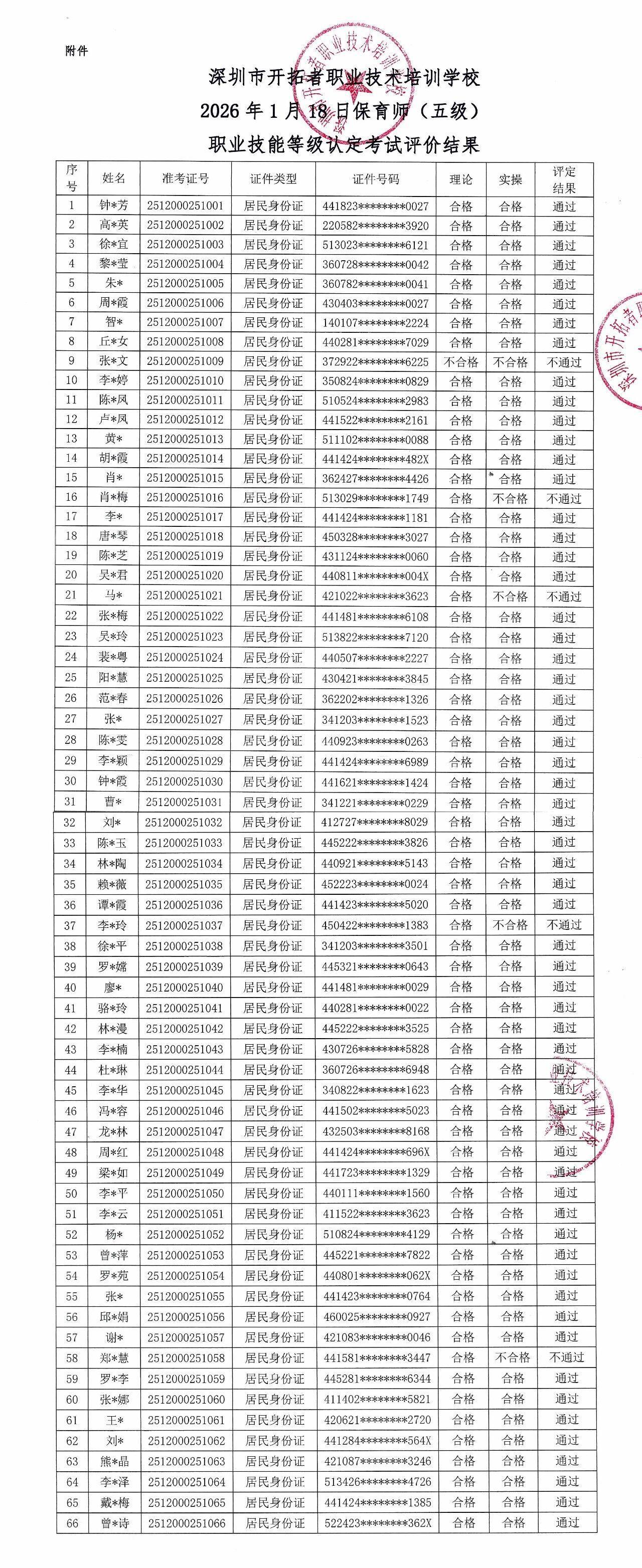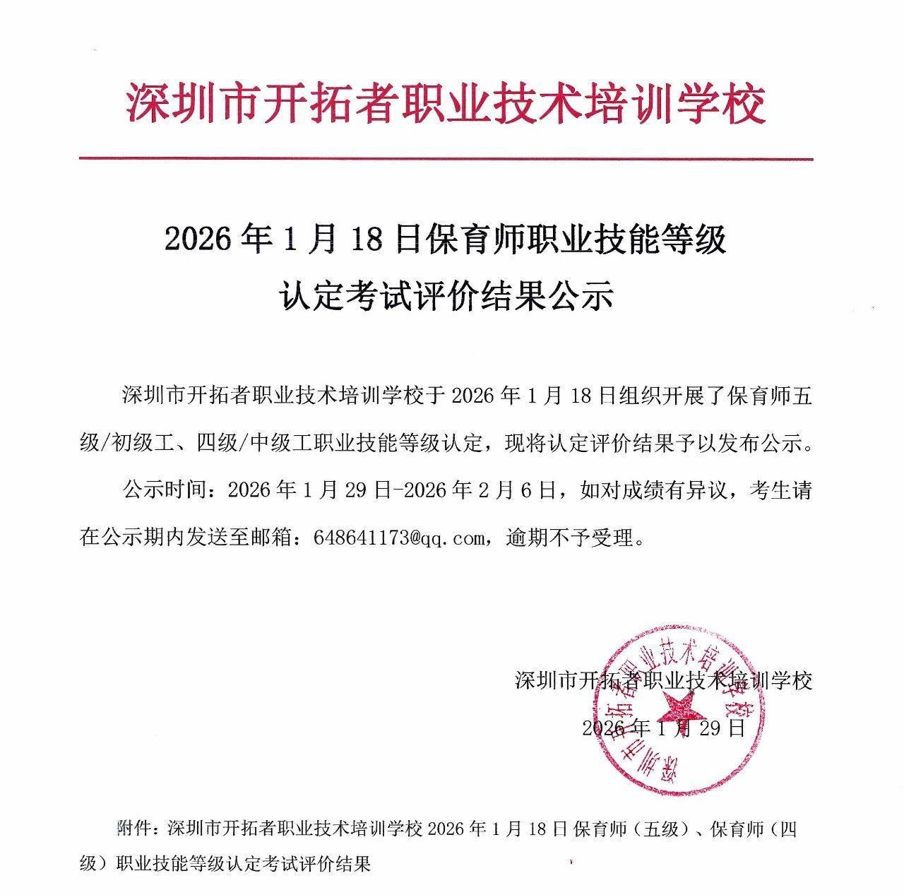 2026年1月18日保育师职业技能等级认定考试评价结果公示
